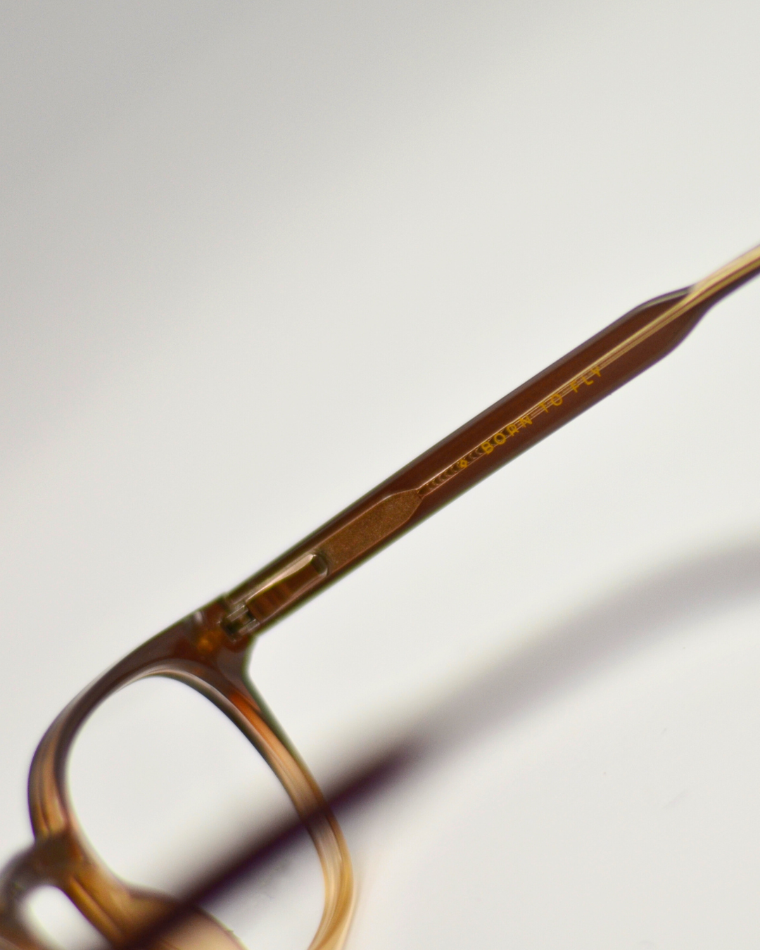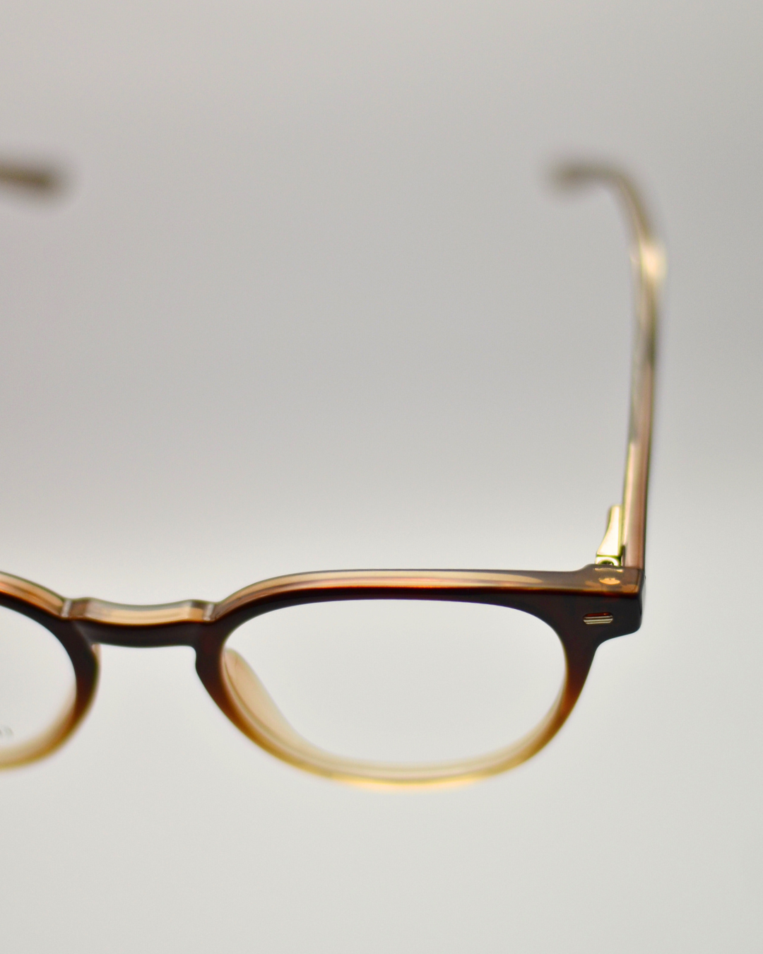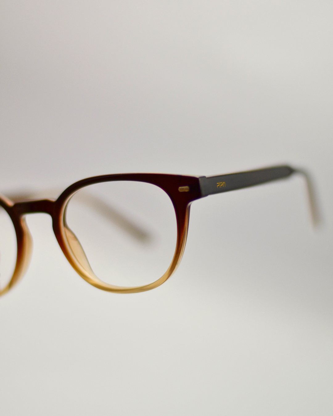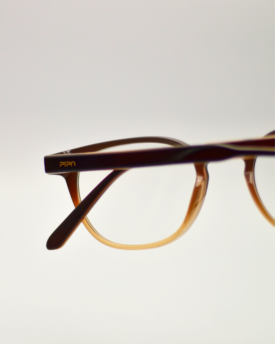 Armação marrom com degrade bege tradicional em nylon leve e resistente. As hastes finas possuem agulhas internas e charneiras flexíveis, que permite conforto e adaptação em qualquer tipo de rosto. O formato frontal retangular, com traços levemente curvados, carrega um design equilibrado e minimalista para o modelo.