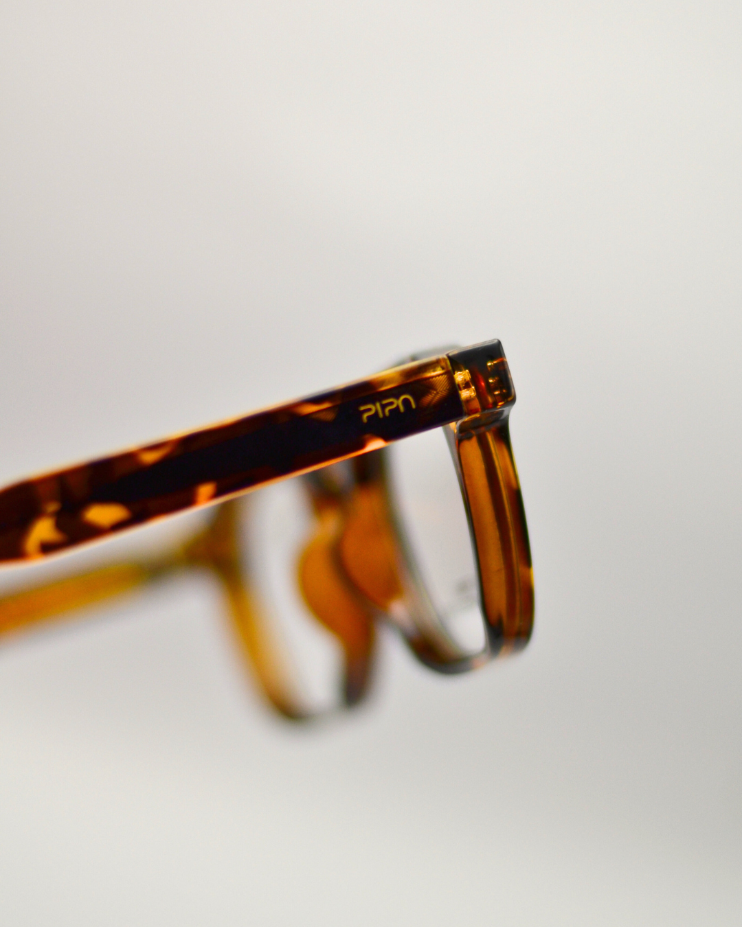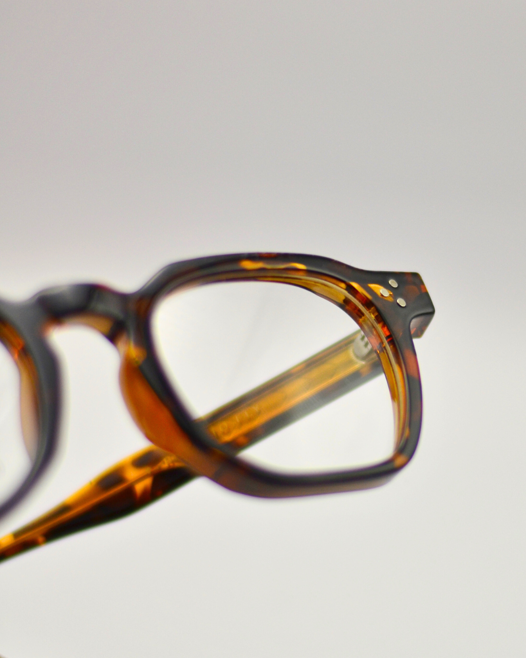 Armação tartaruga em nylon leve e resistente. As hastes mais robustas possuem agulhas internas e charneiras reforçadas, que permite mais conforto e estabilidade no encaixe do rosto. O formato frontal retangular, com linhas levemente curvadas, carrega um design moderno e imponente.